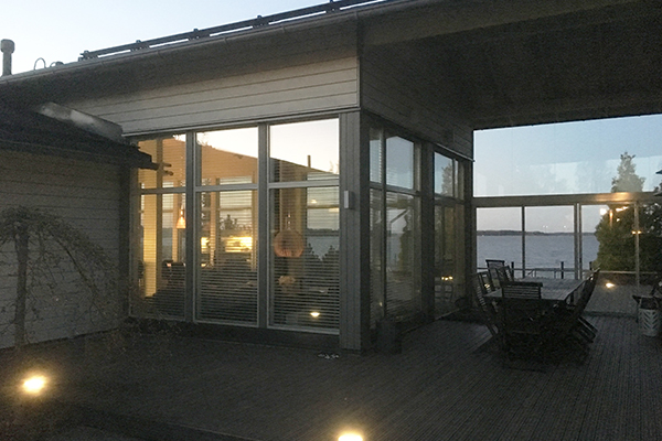 Näiden tilojen välissä on katettu terassi, jonka voi sulkea merelle päin lasisilla liukuovilla, tässä osassa terassia on ruokapöytä 10-12 hengelle sekä kaasugrilli. Takapihalla on katetulla terassilla kylpytynnyri, sekä laituri ja uimaportaat. Etupihalla autokatos kahdelle autolle, lisäksi sivupihalla paikka kahdelle autolle.
