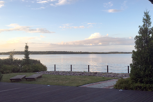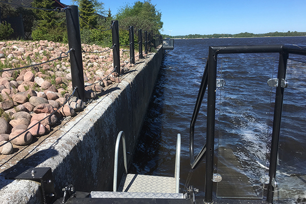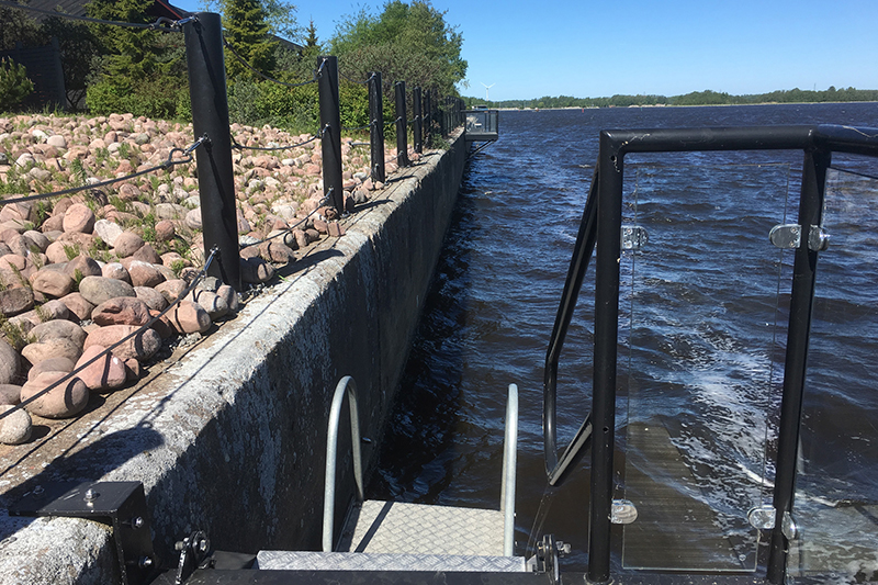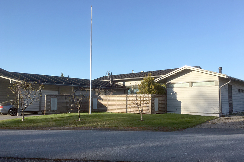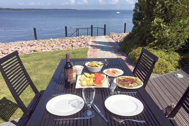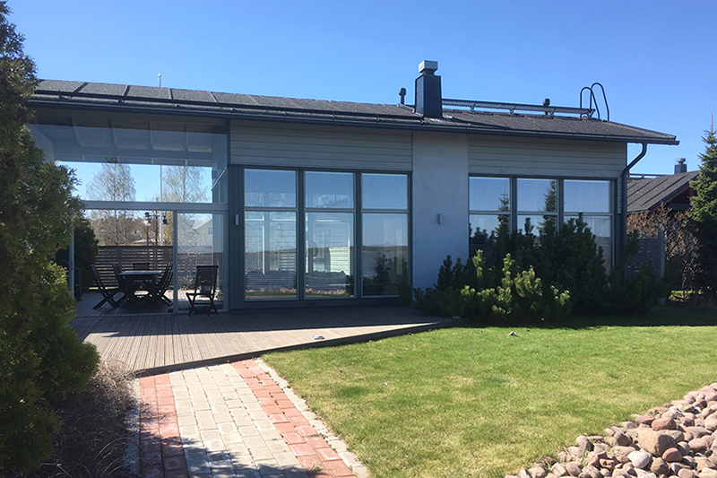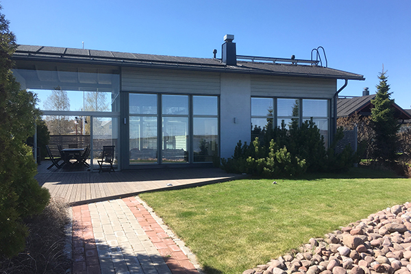 Näiden tilojen välissä on katettu terassi, jonka voi sulkea merelle päin lasisilla liukuovilla, tässä osassa terassia on ruokapöytä 10-12 hengelle sekä kaasugrilli. Takapihalla on katetulla terassilla kylpytynnyri, sekä laituri ja uimaportaat. Etupihalla autokatos kahdelle autolle, lisäksi sivupihalla paikka kahdelle autolle.